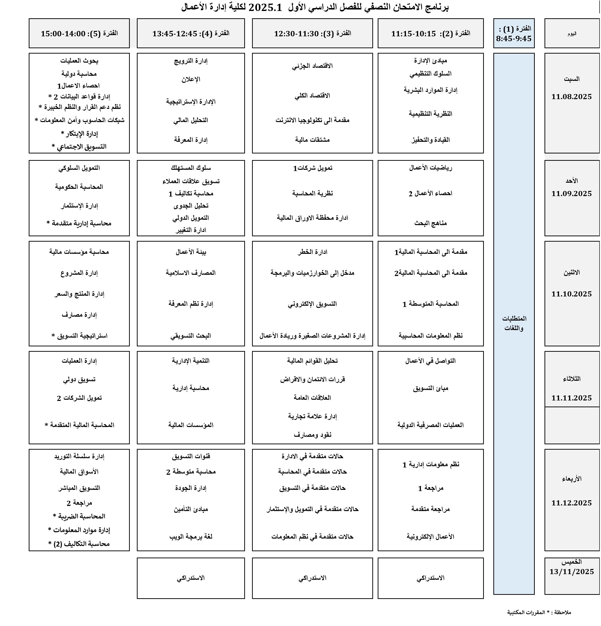 برنامج الامتحان النصفي للفصل الدراسي الأول 2025.1 لكلية إدارة الأعمال